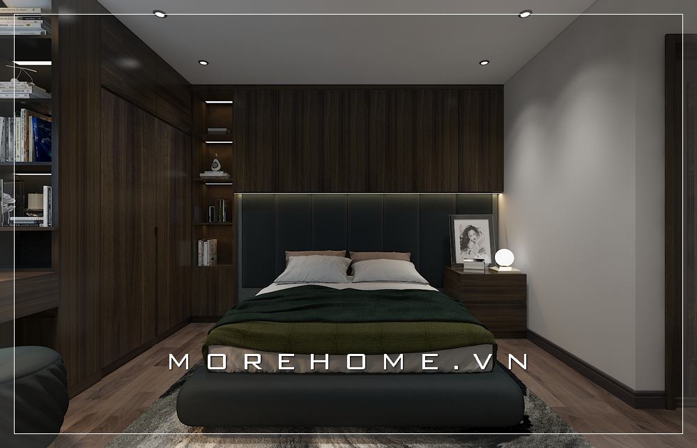 Giường ngủ óc chó bọc da đầu giường nhập khẩu, tone màu nâu trầm gợi lên không gian riêng tư đầy ấm áp cho phòng ngủ Master tại biệt thự hiện đại