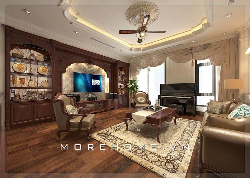 Thiết kế phòng khách biệt thự tân cổ điển với nội thất gỗ tự nhiên cao cấp, sang trọng