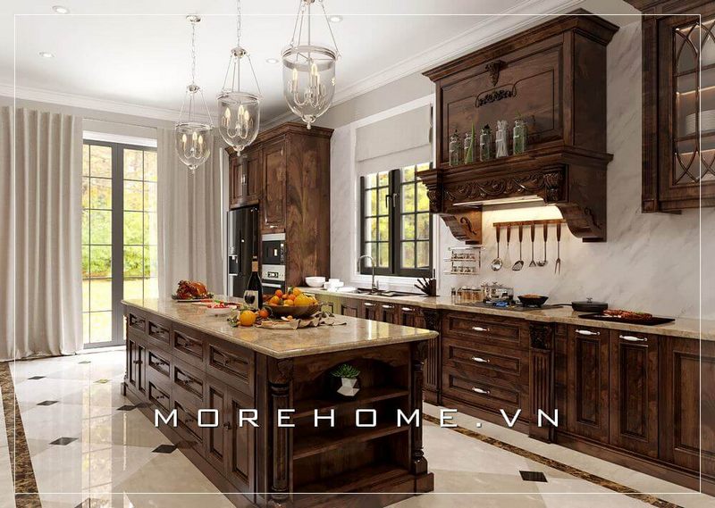 Thiết kế phòng bếp biệt thự tân cổ điển sang trọng với nội thất gỗ tự nhiên tone màu nâu ấm cúng và sang trọng