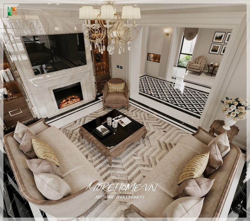 Bộ sofa phòng khách tân cổ điển sử dụng gỗ óc chó tự nhiên kết hợp bọc nỉ nhung màu nâu sang trọng cho phòng khách biệt thự, nhà phố, chung cư